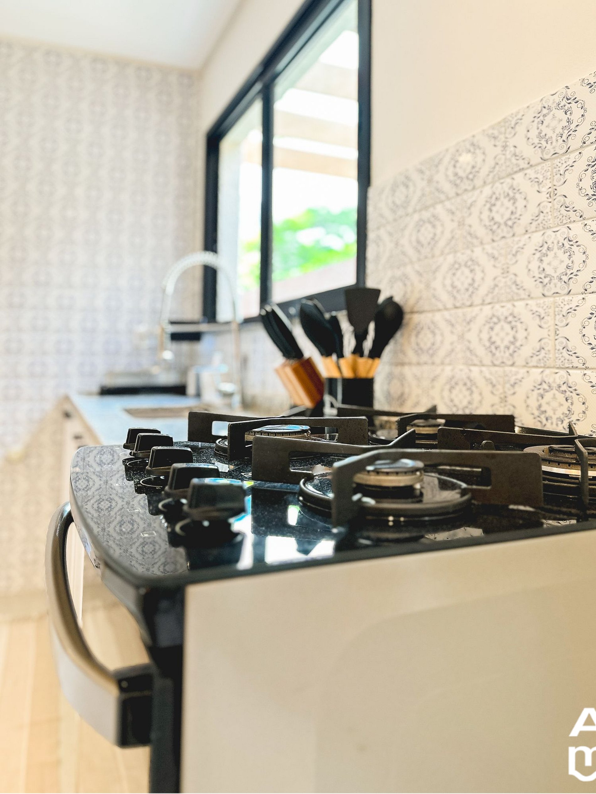 Cocina Completa: Totalmente equipada con refrigerador, cafetera eléctrica, licuadora, estufa con horno, microondas, airfryer y todos los utensilios básicos necesarios para preparar comidas.