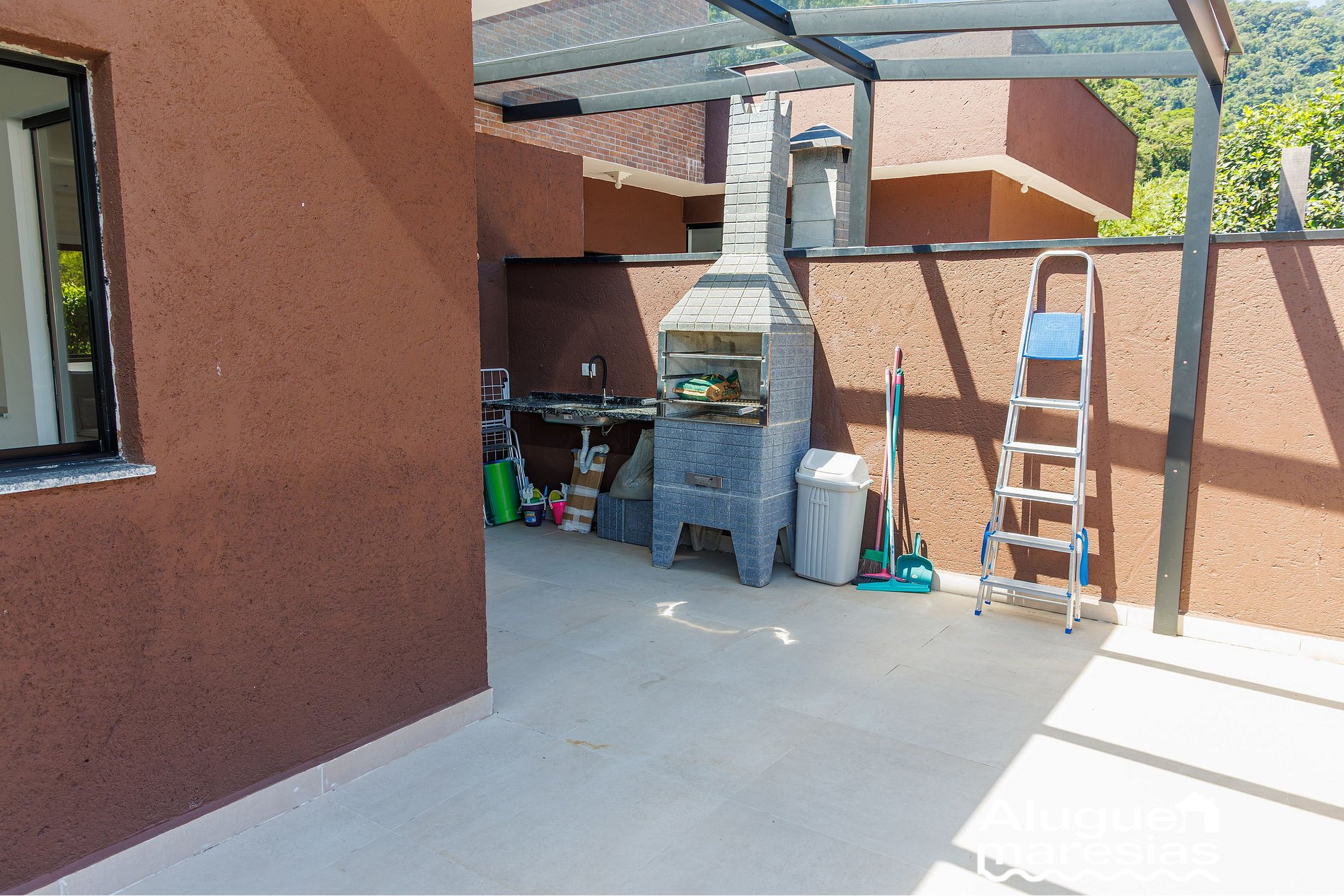 • Terraço privativo com churrasqueira, mesa de camping e vista para a piscina